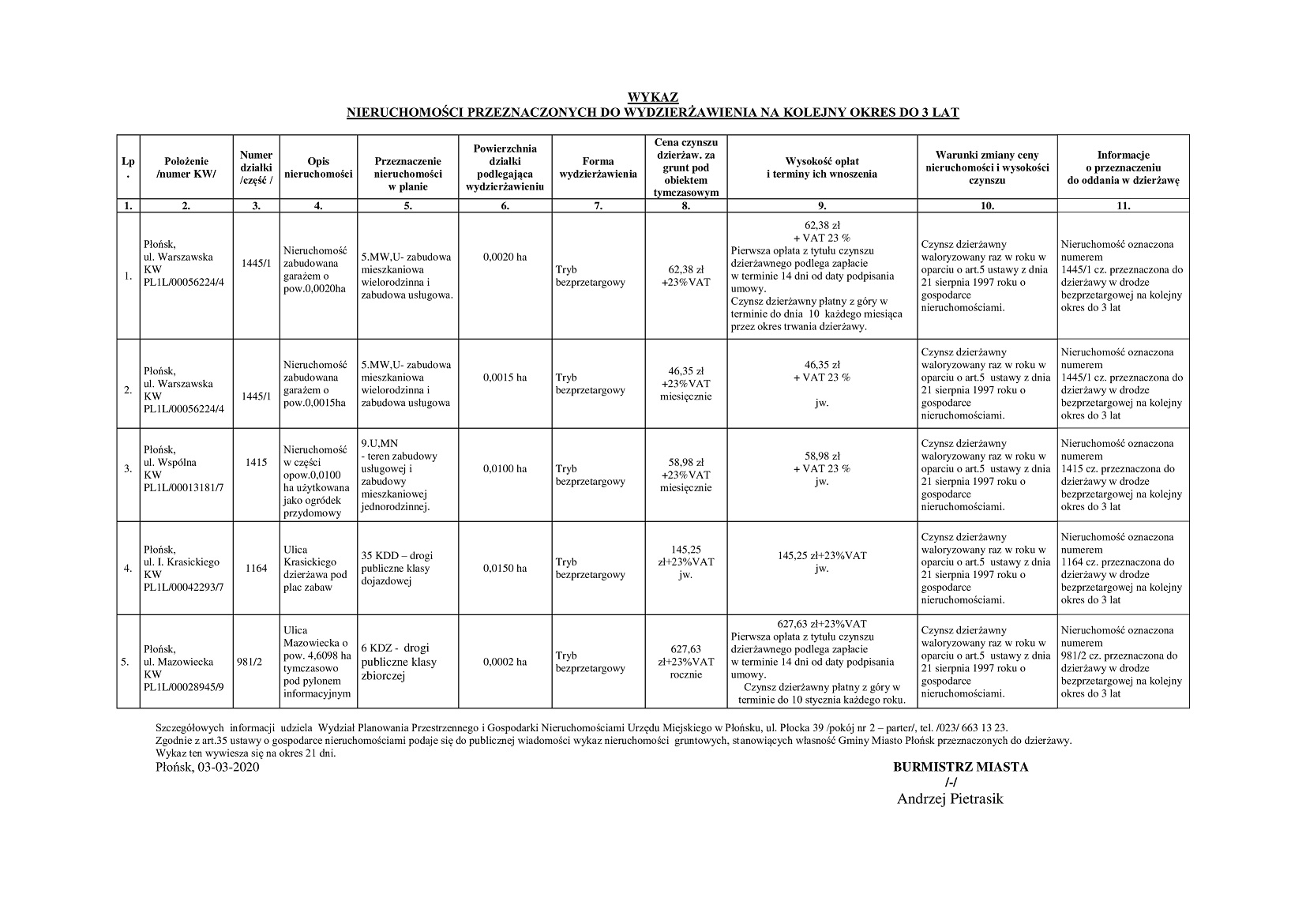 WYKAZ NIERUCHOMOŚCI PRZEZNACZONYCH DO WYDZIERŻAWIENIA NA KOLEJNY OKRES DO 3 LAT